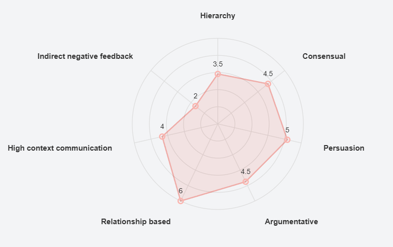 Cultural Orientation Map™ is not a rating. It is a representation of your cultural orientation based on your responses. This information can help you understand how you project your culture in different contexts. To dive deep into what each of these cultural parameters means, please check the links in the footer.