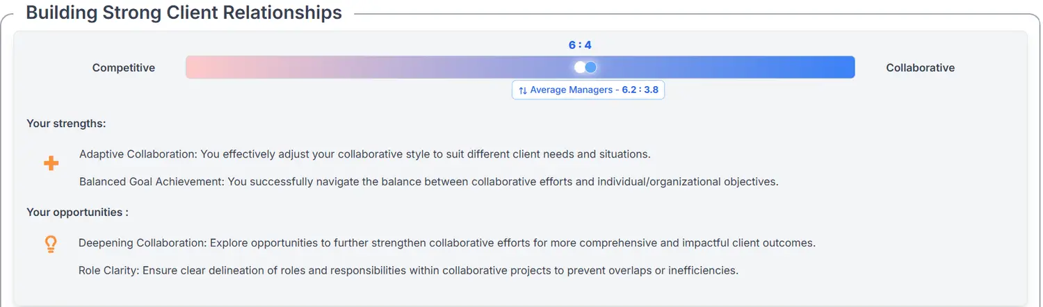The Cognitive Leadership Profile™ is an AI-powered psychometric assessment that provides deep insights into your behavioral patterns, leadership style, and cognitive abilities. Benchmarked against 5,000+ managers and validated through extensive reliability testing, this comprehensive report helps identify your unique strengths and growth areas. Organizations leverage these insights for succession planning, team composition, coaching programs, and role-specific development in areas like sales and leadership.