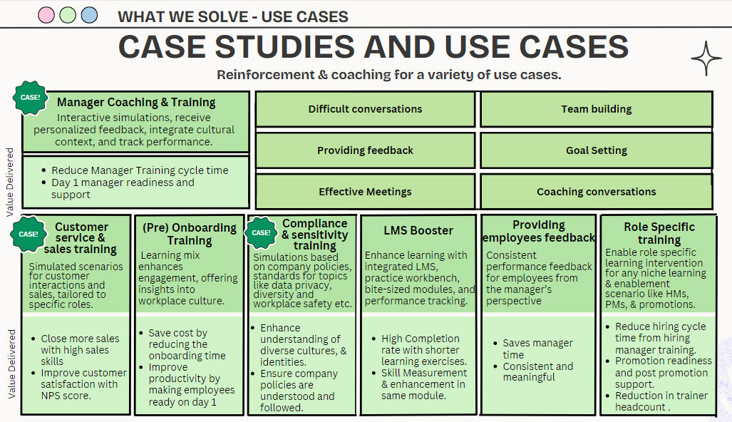 Coachbots enabled coaches helped our consultants to be more aware and ace the client conversations with ease. The depth and level of enablement provided in the pilot batch surpassed expectations. The ability to customize the scenarios was very effective.